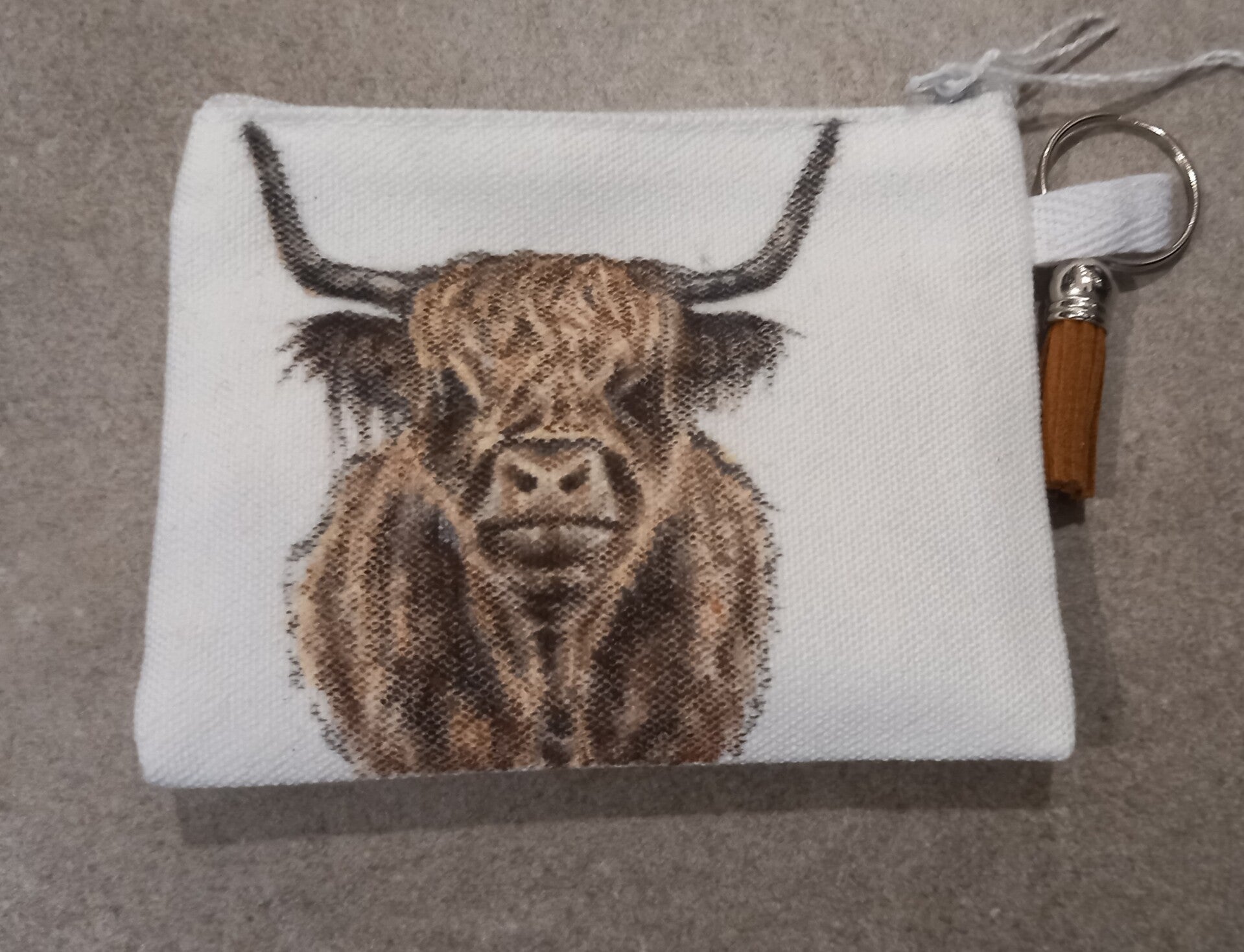 Een zachtwit geldtasje, waarop een dier/meerdere dieren op getekend zijn met acrylmarkers.